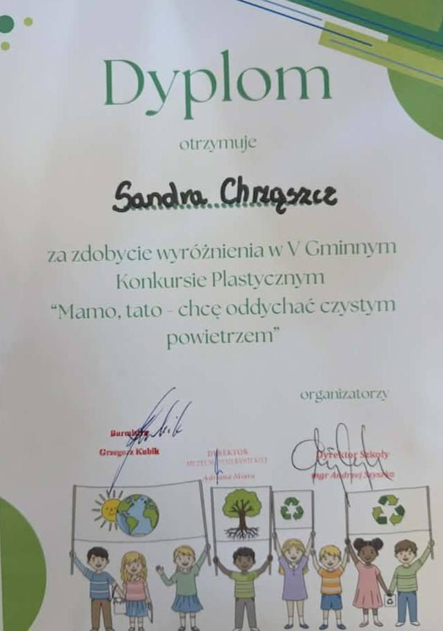 Z wielką dumą informujemy,że uczennica klasy V, Sandra Chrząszcz, otrzymała wyróżnienie w V Gminnym Konkursie Plastycznym " Mamo, tato, chcę oddychać czystym powietrzem".