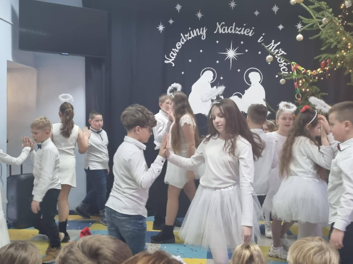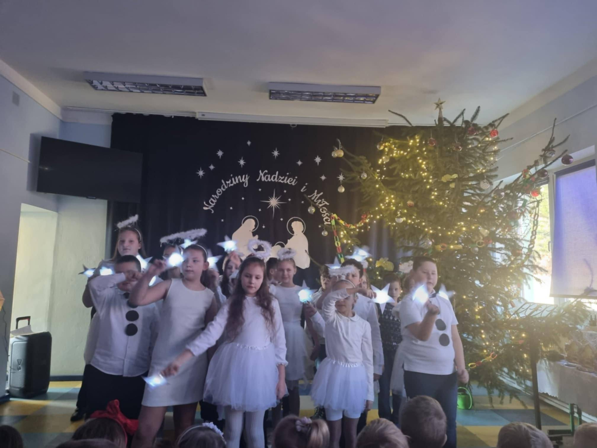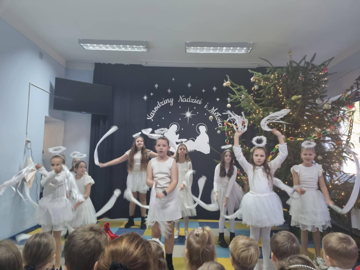 19 grudnia uczniowie kl.3 i 4 zaprezentowali wyjątkowe, bożonarodzeniowe przedstawienie pt. "Najpiękniejszy dzień w roku", połączone z tańcem aniołów i wspólnym śpiewem kolęd. Z wielkim zaangażowaniem przygotowali oni recytację wierszy, piosenki i tańce, które przeniosły nas w piękny, świąteczny czas. Swoje umiejętności wokalne i muzyczne prezentowali też chętni uczniowie i uczennice z kl.2, 5, 6, 7 i 8, grając i śpiewając przygotowane przez siebie utwory świąteczne.